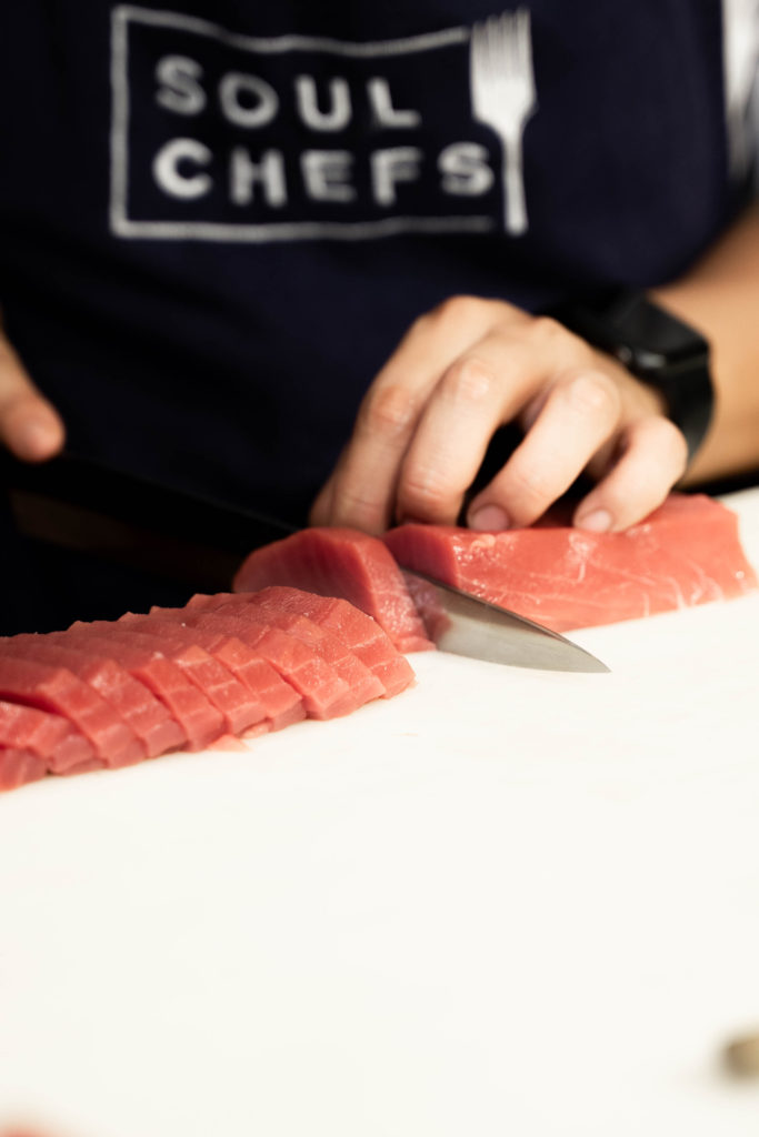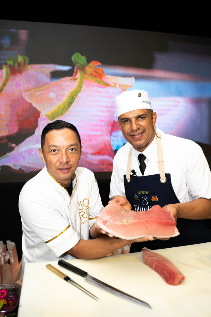 Quem comanda o ritual de abertura do bluefin com aproximadamente 100 quilos é o chef Bruno Kamakura. O atum azul mexicano, das águas do Pacífico, é da empresa Bluefiná, que o cultiva cuidadosamente e o alimenta com anchovas e sardinhas, uma dieta oceânica natural.