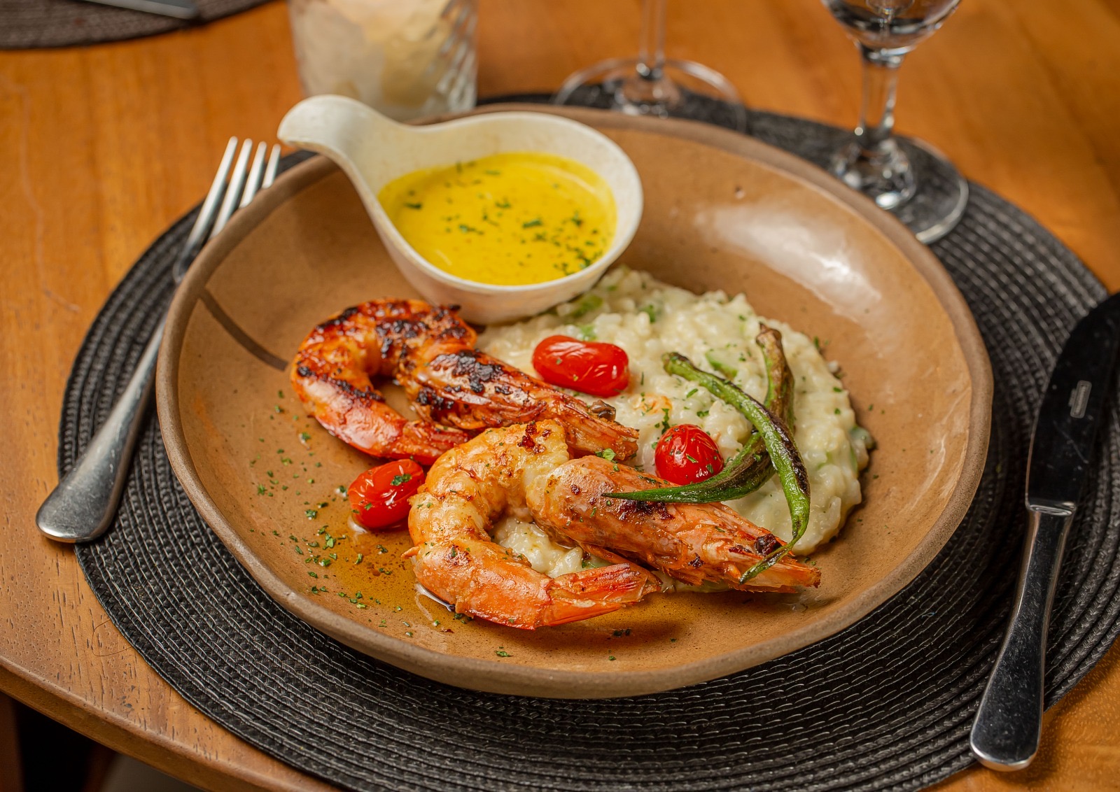 A pedida fica por conta dos Camarões Pistola grelhados na manteiga de ervas especial do chef, servidos com risoto de aspargos, tomate sweet grape, quiabo grelhado e molho curry, à parte, para quem quiser um toque a mais de especiarias (R$158, individual).