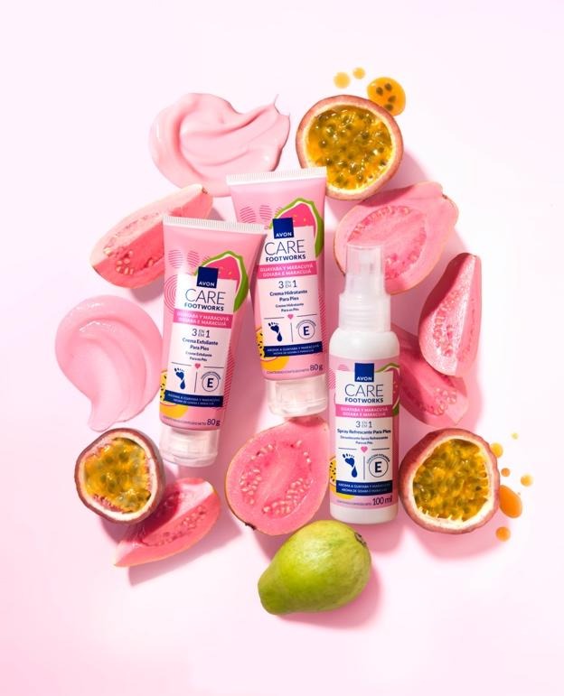 Já o Avon Care Footworks Goiaba e Maracujá leva o cuidado para outra etapa essencial da rotina: os pés. A combinação tropical das notas de goiaba e maracujá traz frescor imediato, enquanto a performance dos itens, como o Spray Refrescante 3 em 1 e o Creme Esfoliante com Vitamina E, garante proteção contra odores, maciez e renovação das áreas mais ressecadas, estendendo a experiência completa de cuidado da cabeça aos pés.