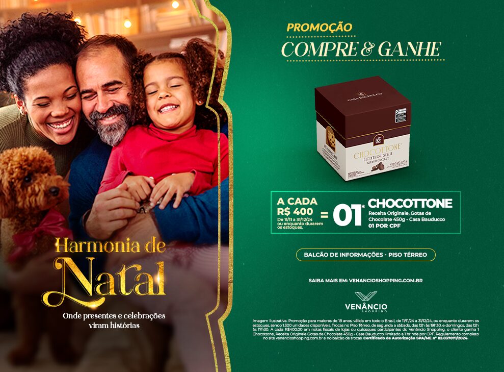 O Venâncio Shopping realiza a campanha compre e ganhe, a cada R$ 400 em compras, clientes podem trocar seus cupons fiscais peloChocottone Receita Originale, Gotas de Chocolate, 450g da Casa Bauducco. A troca acontecerá de 11 de novembro a 31 de dezembro de 2024 ou enquanto durar o estoque. E pode ser realizada no Balcão de Informações, de segunda a sexta-feira, de 10h até às 19h30. Sábados, domingos e feriados, das 10h às 17h30. Para participar, basta cadastrar as notas no espaço de trocas ou pelo Webapp do shopping (https://m.venancioshopping.com.br/) que pode ser acessado diretamente pelo navegador da web, sem a necessidade de download ou instalação, tornando a participação ainda mais rápida, prática e conveniente. O brinde é limitado a uma unidade por CPF. O regulamento pode ser consultado em www.venancioshopping.com.br.