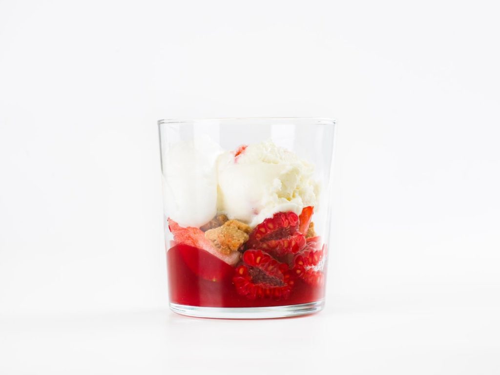 Pistache e Frutas Vermelhas: Helado de Pistache, Gel de framboesa, Nougatine de Pistache, praline de pistache, morango picado, framboesa e Nata.