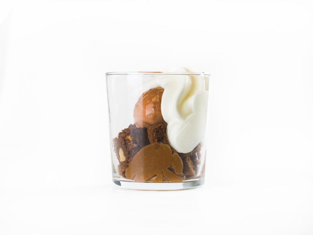 Muerte por Chocolate: Helado de Chocolate Negro 70%, calda de chocolate Negro 70%, ganache de chocolate ao leite, nougatine de nibs de cacau, crumble de chocolate, brownie em dados e Nata.
