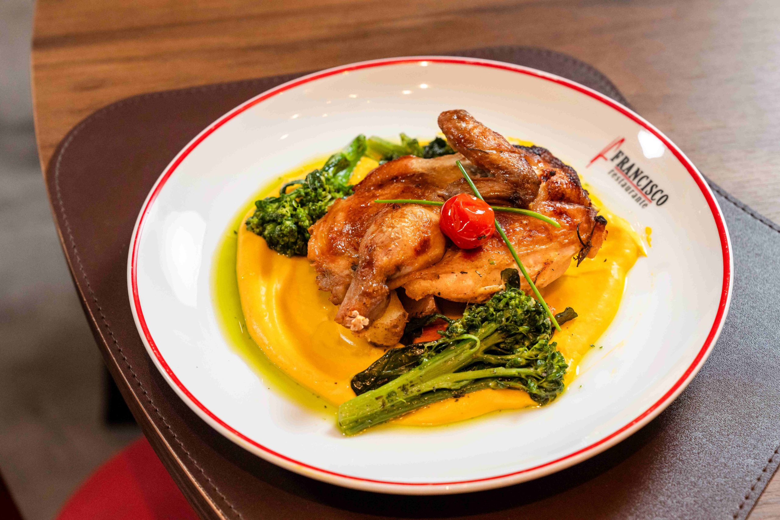- Galeto assado com mousseline de abóbora e legumes salteados