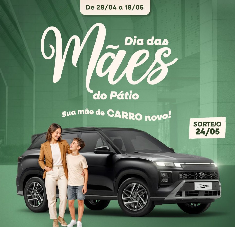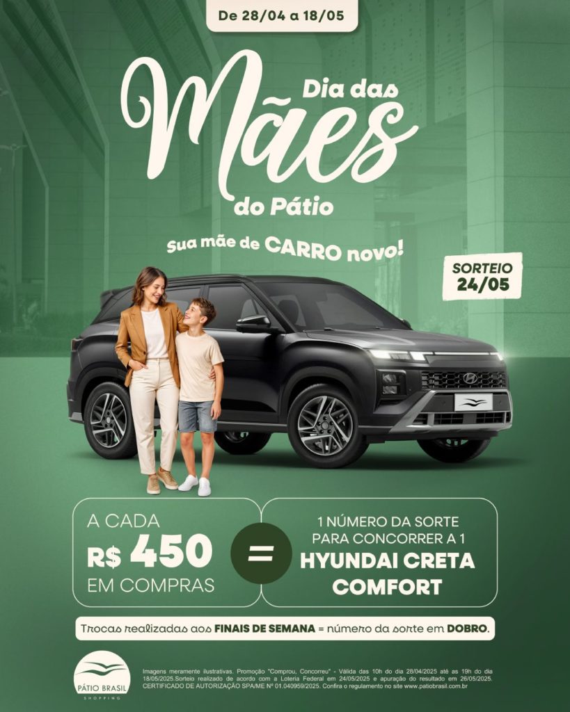 Tem gesto mais bonito do que retribuir todo amor que recebemos de mãe? Neste Dia das Mães, o Pátio Brasil Shopping transforma o carinho em oportunidade: além de encontrar o presente perfeito para ela, você ainda pode levá-la de carro novo para casa. Isso mesmo! A cada R$ 450 em compras, você garante um número da sorte para concorrer a um Hyundai Creta Comfort, um carro desejado por muitos brasileiros, que une design arrojado, amplo espaço interno e tecnologia de ponta.