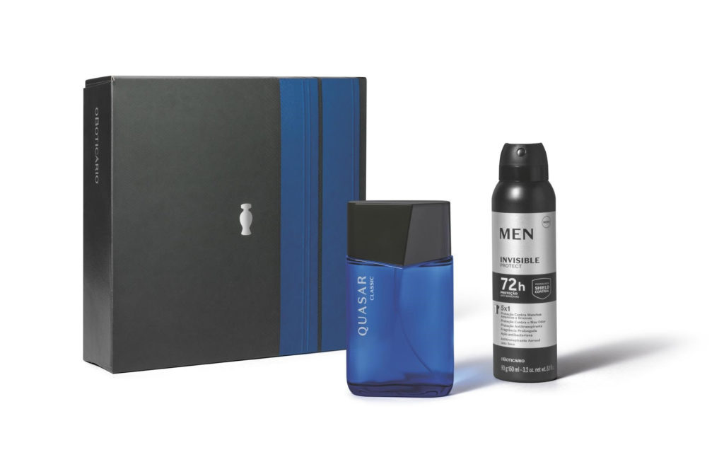 Outra opção é o Kit Presente Dia dos Pais Malbec Ultra Bleu, ideal para encantar aquele pai que é único, possui um frescor intenso, combinado à força do amadeirado de Malbec. O kit conta com Malbec Ultra Bleu Desodorante Colônia, com notas ultrarrefrescantes do vinho francês maturado no fundo do mar mediterrâneo, e um Balm Pós Barba Malbec Club, que ajuda a minimizar as irritações causadas pelo barbear. Para os pais cheios de personalidade que foca nos próprios objetivos, o Kit Presente Dia dos Pais Quasar Classic é ideal! Possui o Quasar Classic Desodorante Colônia, que traz as notas clássicas de frescor combinadas às notas de bergamota, limão e mandarina, com intenso fundo amadeirado: um ícone da perfumaria brasileira que incentiva o homem a ir além; e o Antitranspirante Aerosol Jato Seco Men Invisible Protect, que entrega praticidade e proteção para as axilas sem manchar as roupas, entregando 72 horas de proteção antibacteriana por meio da exclusiva Tecnologia Shield Control, desenvolvida por experts em ciência da pele.