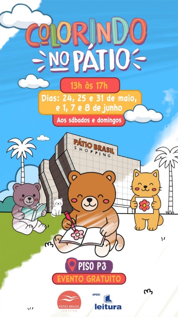 O Pátio Brasil Shopping, em parceria com a Livraria Leitura, promovem o evento “Colorindo no Pátio”, uma experiência única que convida crianças e adultos a mergulharem no universo encantador das figurinhas fofas para colorir – um fenômeno que se tornou uma febre nas redes sociais e no cotidiano das famílias brasileiras. O evento acontece nos finais de semana de maio e junho, nos dias 24, 25 e 31 de maio e 1, 7 e 8 de junho, das 13h às 17h, no Piso P3, próximo à loja Daiso.