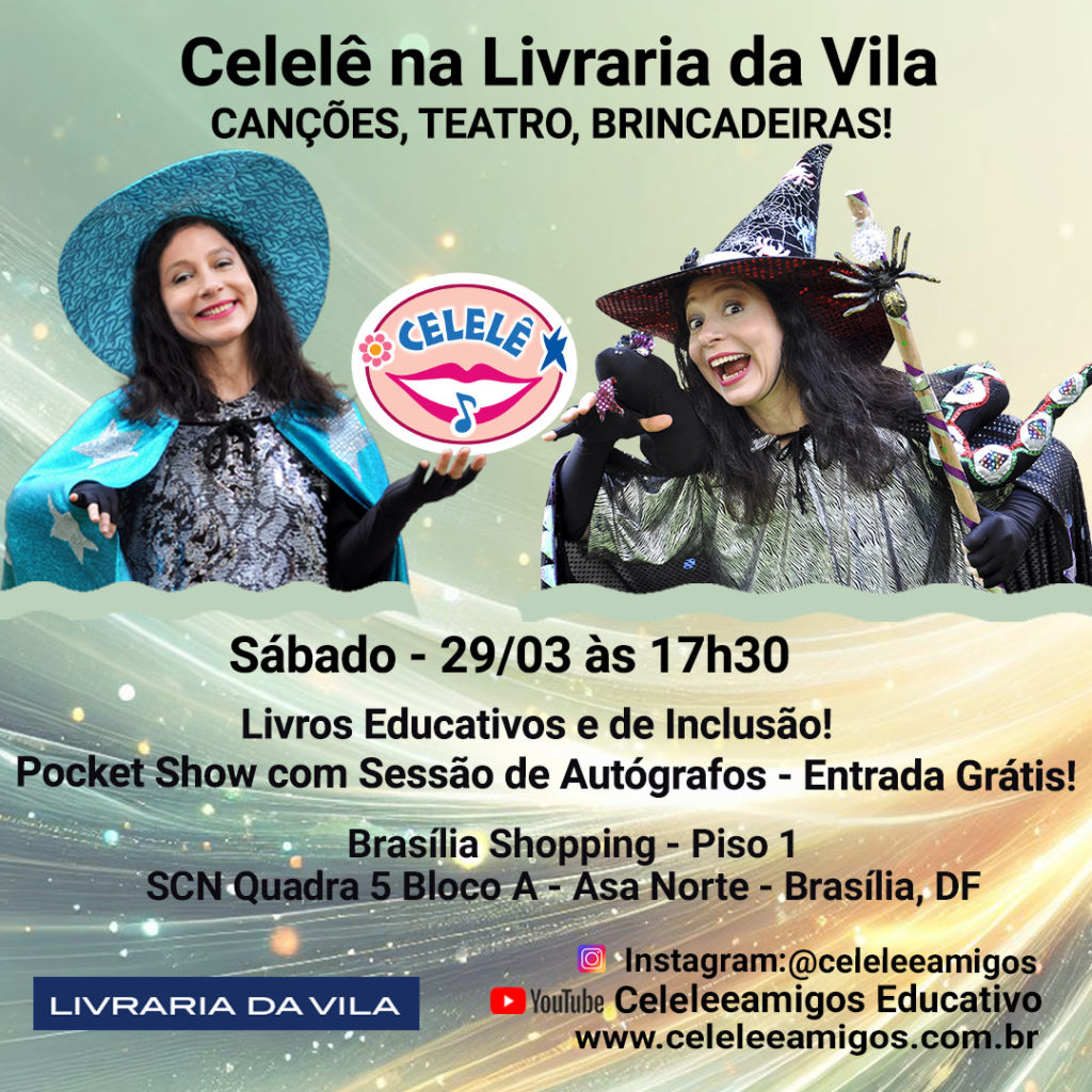 É com entusiasmo que convidamos você para conhecer o trabalho educativo da artista, autora e musicoterapeuta Celise Melo (Celelê), na Livraria da Vila do Brasília Shopping (DF) com seu mais recente livro “Viver com Alegria” (Flamingo Edições) e também o título “Os Amigos na Selva Divertida”, ambos da coleção “Canções e Histórias” da Celelê. Por gentileza, se possível, contamos com seu apoio na divulgação do evento.