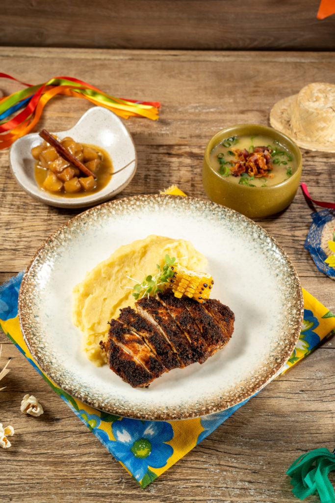 Prato Principal: black chicken com purê de batata doce (filé de peito de frango temperado ao estilo Cajun, servido com purê e milho grelhado)