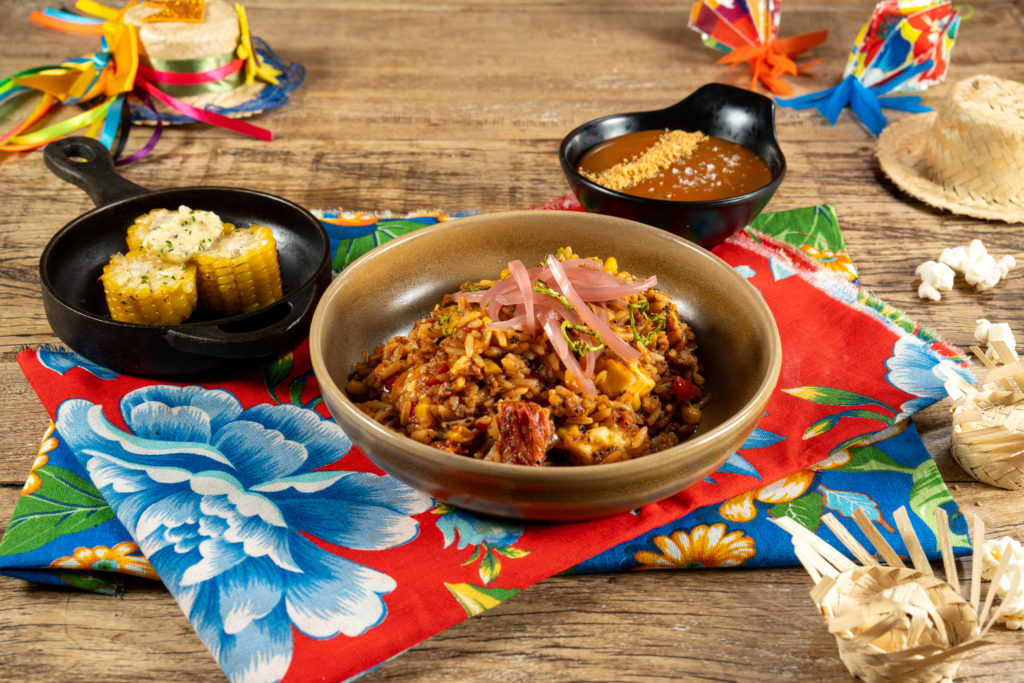 Prato principal: arroz junino com linguiça artesanal, queijo coalho, picles de cebola roxa, pimenta de cheiro e molho