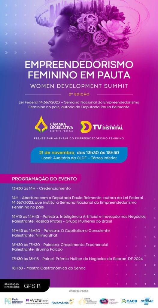 O Women Development Summit (WDS) será realizado em 21 de novembro no auditório da Câmara Legislativa do Distrito Federal, sob o comando do Conselho da Mulher Empreendedora e da Cultura (CMEC), presidido por Beatriz Guimarães, e com o apoio da deputada Paula Belmonte. O evento é organizado pela empresária Paula Santana, da GPSIR Eventos.